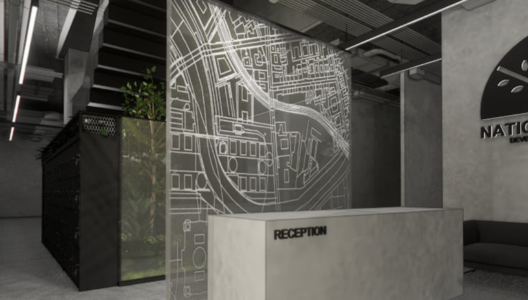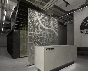 The National Park Office showcases an Industrial Minimalist design that emphasizes functionality, simplicity, and transparency. Exposed ceilings with black lighting fixtures and gray plastered concrete walls create a raw, contemporary industrial feel, while walnut meeting tables and faux greenery introduce warmth and balance. This design achieves a modern and cohesive workspace that reflects efficiency, sophistication, and the core values of industrial minimalism.